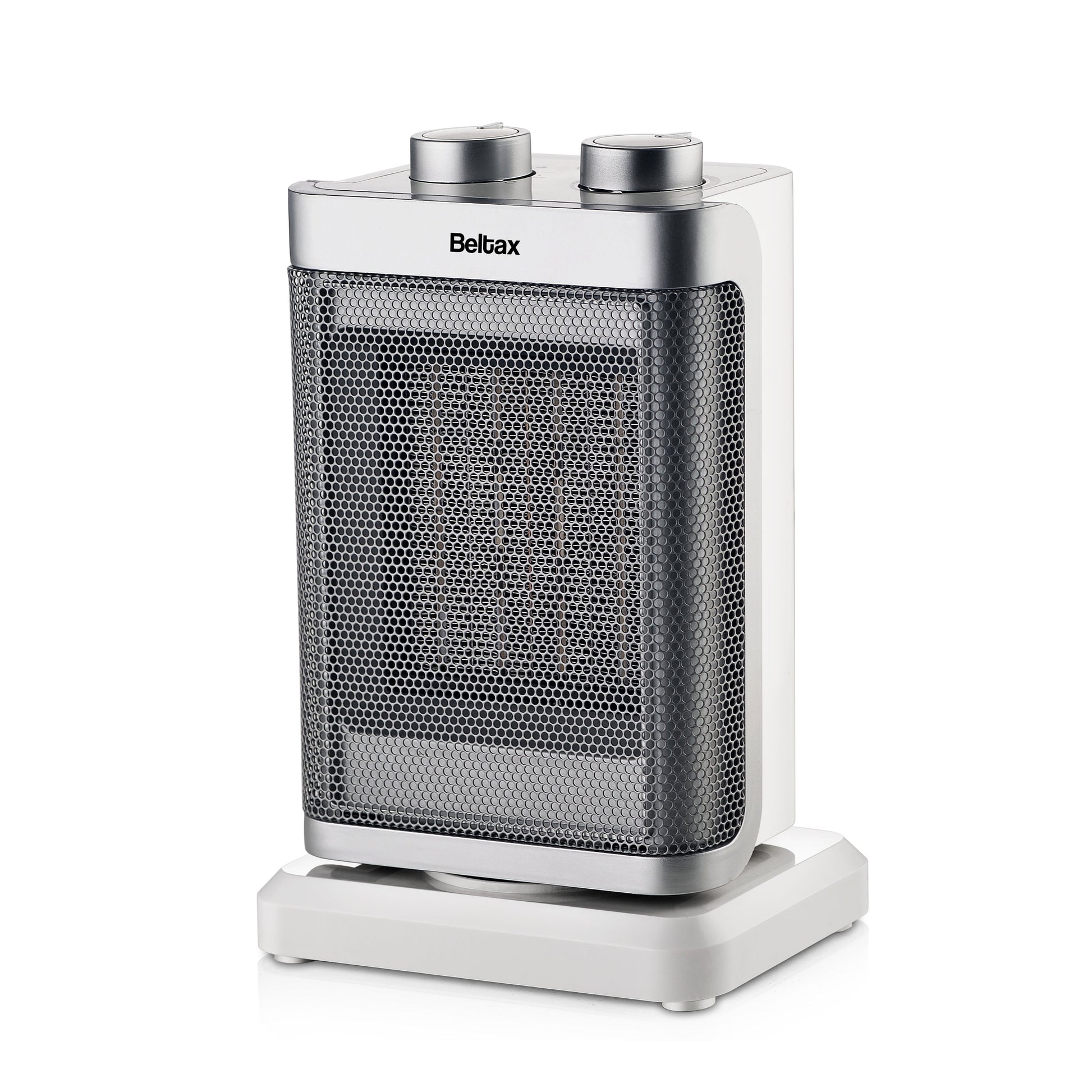 Aquecedor cerâmico Beltax BCH1502 com potência de 1500 W, equipado com função de oscilação e termostato regulável para controlo preciso da temperatura.