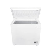 Arca horizontal de 198L com termostato digital e classe energética E, ideal para armazenamento de grandes quantidades de alimentos congelados.