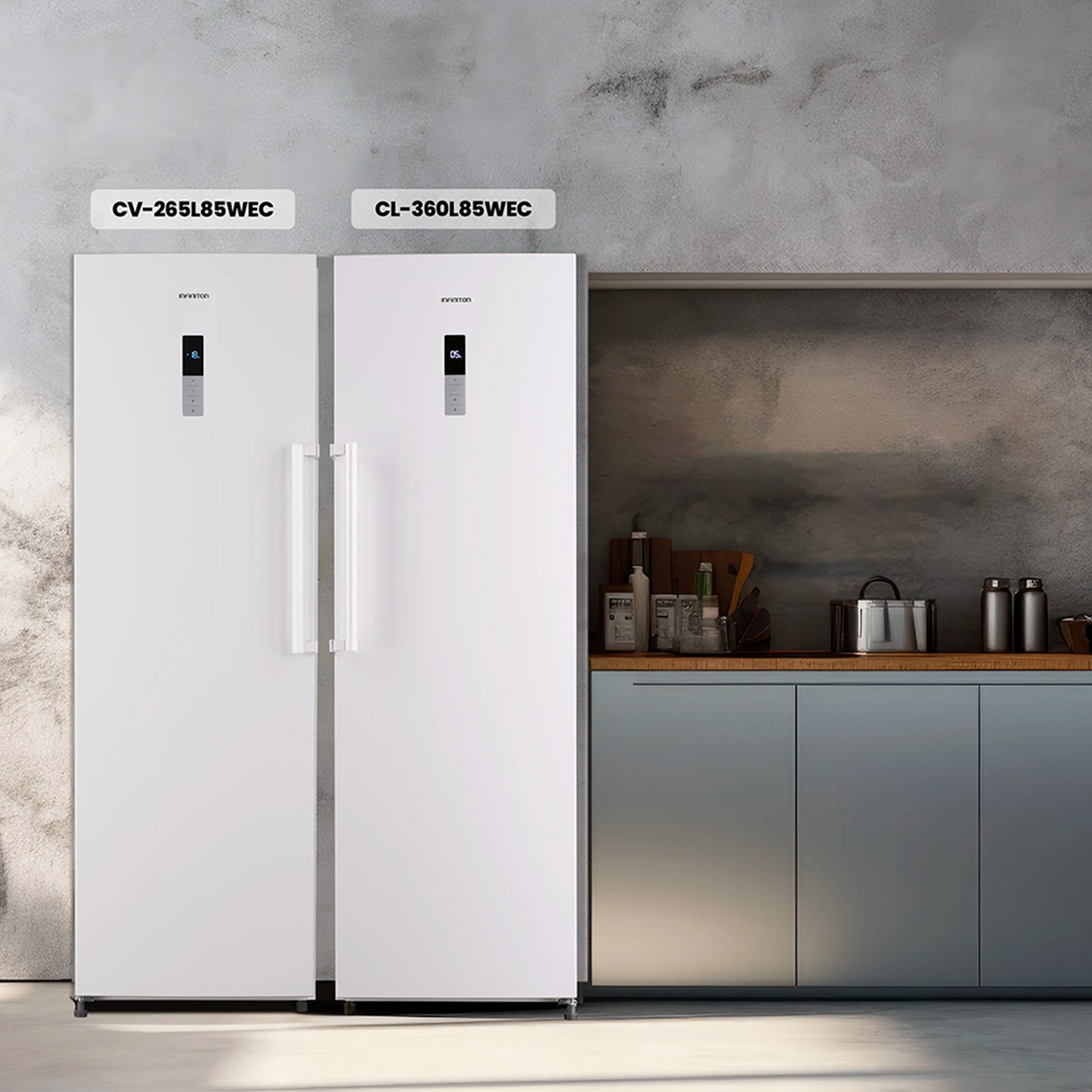 Arca vertical com tecnologia Inverter e sistema Frost Free para conservação eficiente e prática.