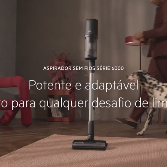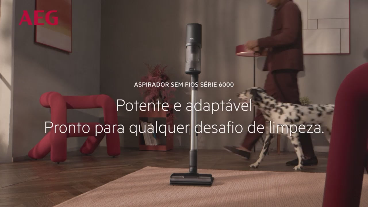 Aspirador vertical sem saco AEG com autonomia máxima de 50 minutos e potência de sucção de 85 W, ideal para limpezas versáteis e eficientes.