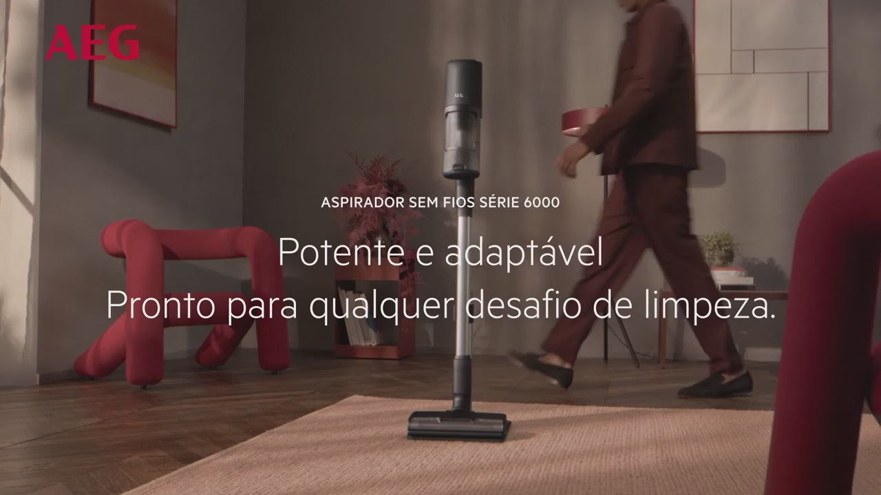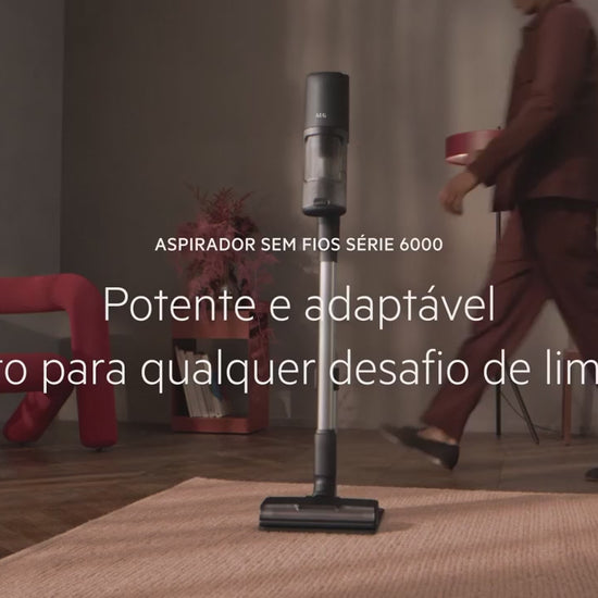 Aspirador vertical AEG com autonomia máxima de 50 minutos e potência de sucção de 85 W, equipado com escova UltimatePower multi superfícies e filtragem de 99,92%.