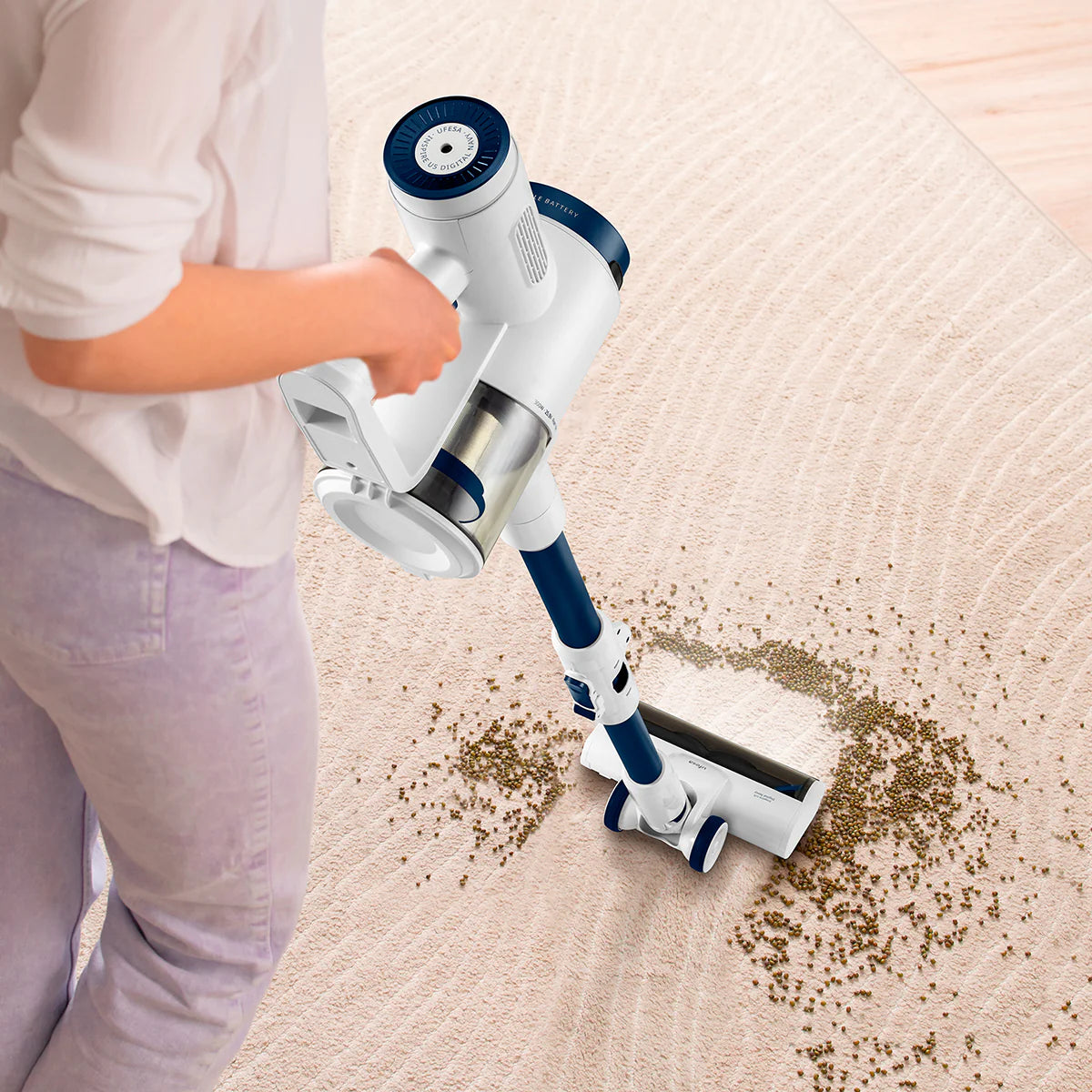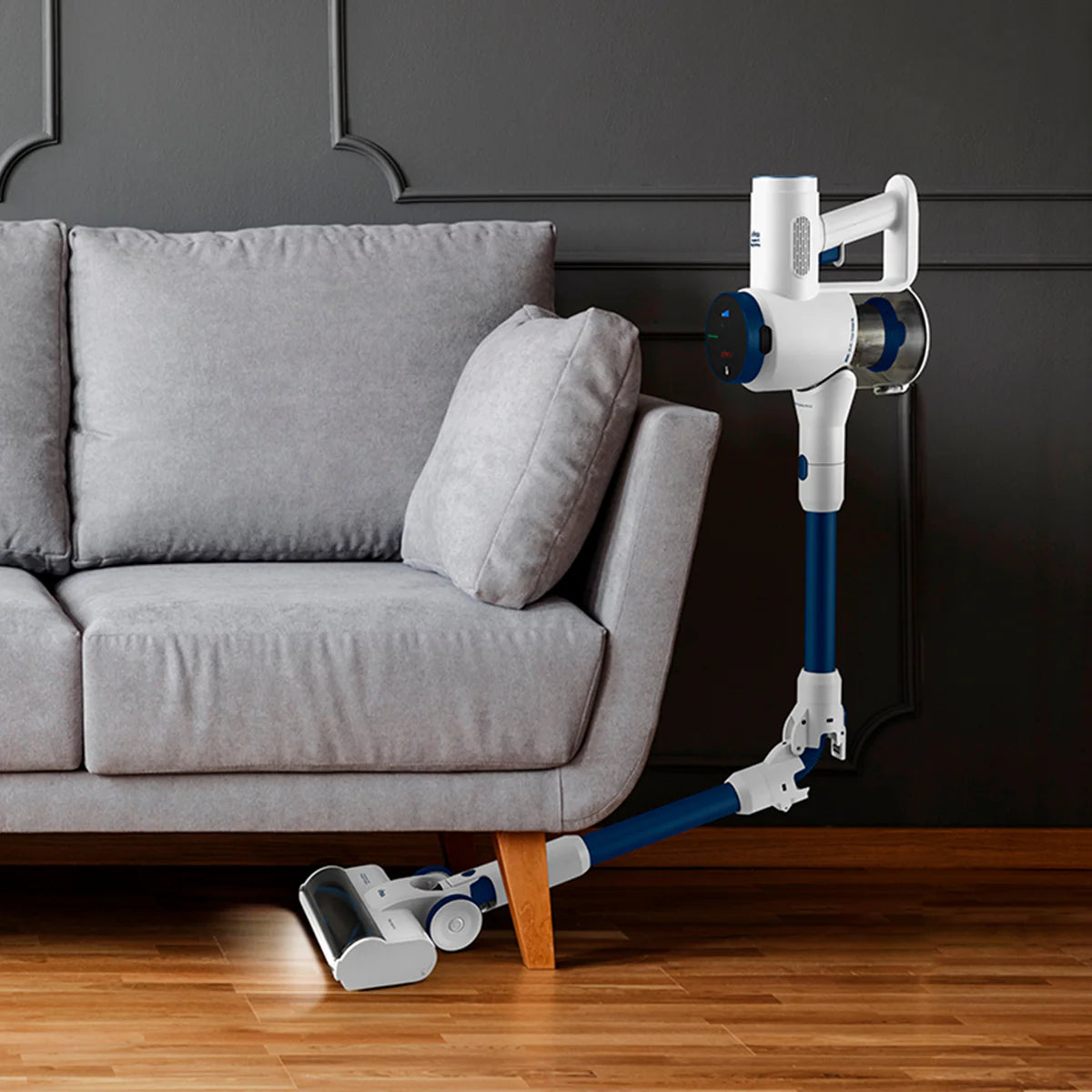 Aspirador vertical com motor digital Brushless, autonomia até 40 minutos e potência máxima de 300W, ideal para limpezas eficientes e versáteis.