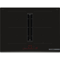 Placa de indução Bosch Serie 6 PVQ731H26E com 4 zonas e largura de 71 cm, equipada com sistema de extração integrado e potência máxima de 7400 W.