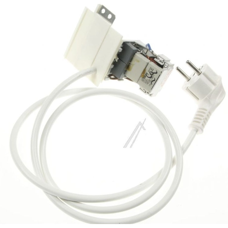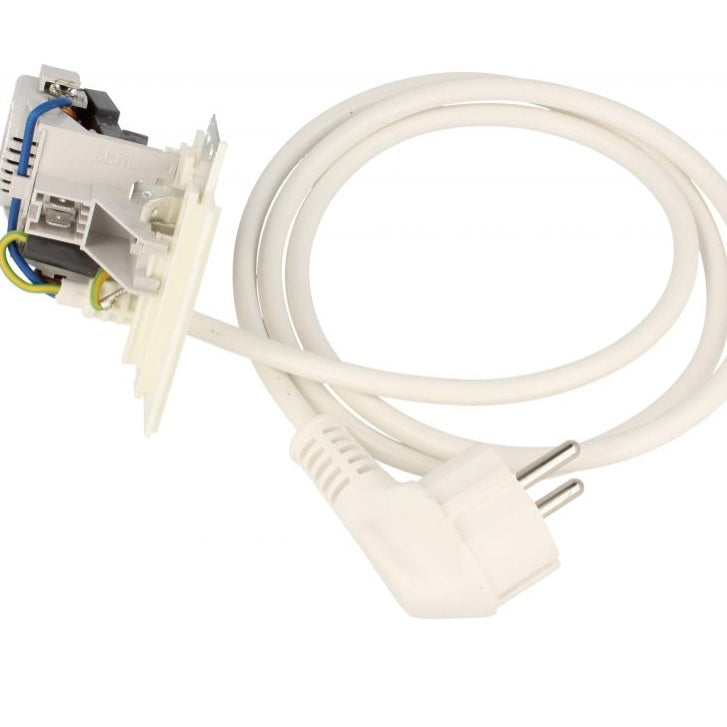 Cabo de alimentação com filtro RFI de 1,1 metros para máquinas de lavar roupa Whirlpool/Indesit, com ficha específica do fabricante e sistema antiparasita integrado.