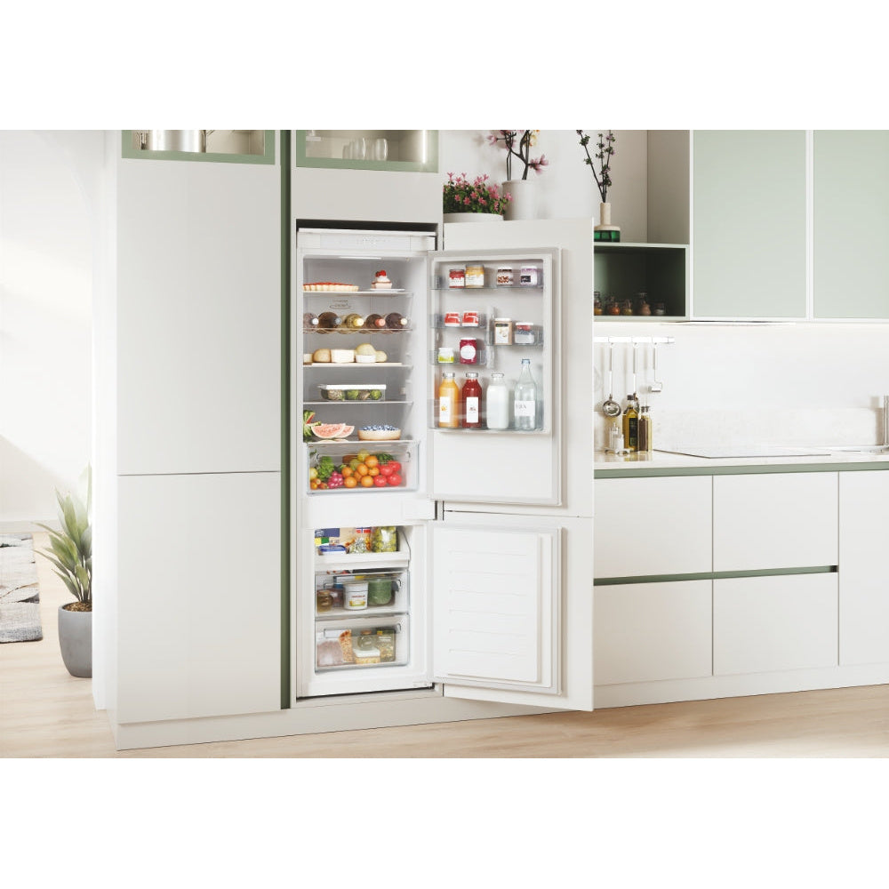 Frigorífico combinado encastrável com capacidade total de 248L e tecnologia No Frost para descongelação automática.