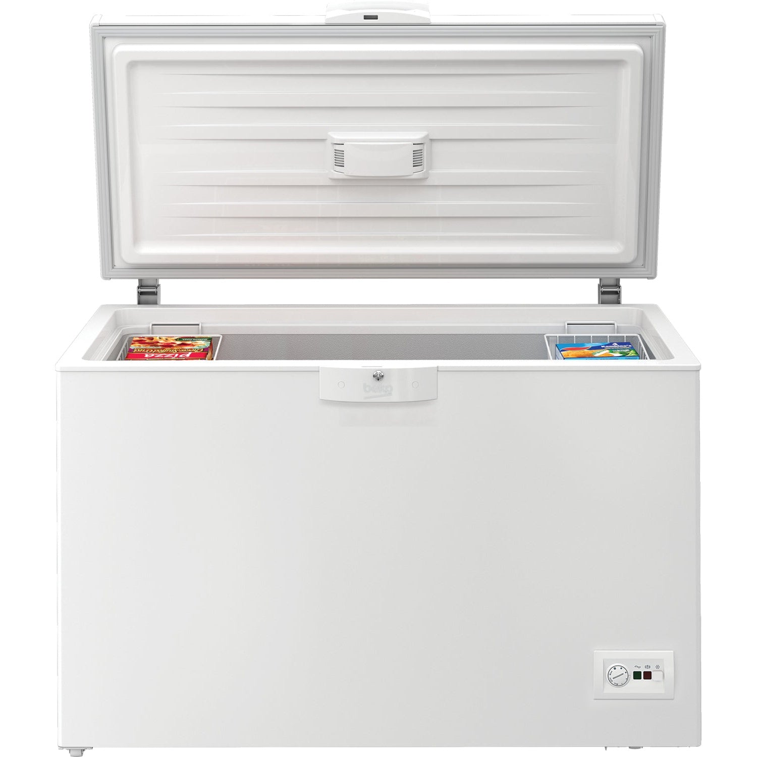 Congelador horizontal de 284 L com classe energética D e tecnologia Freezer Guard, ideal para armazenamento de grandes quantidades de alimentos congelados.