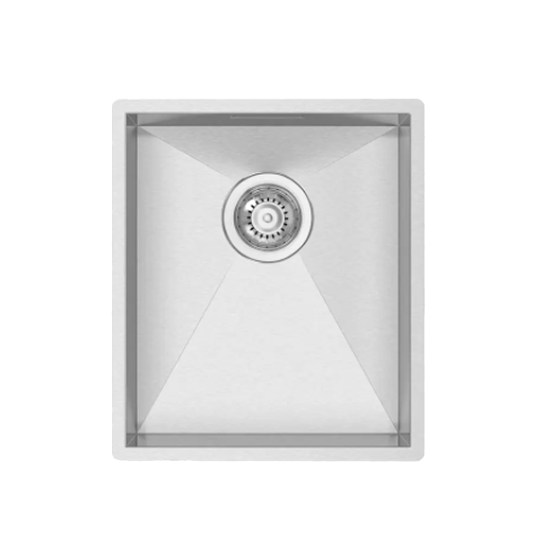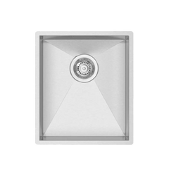 Cuba de aplicação inferior com medida externa de 376x436mm e profundidade de 200mm, fornecida com sifão e válvula manual de cesta.