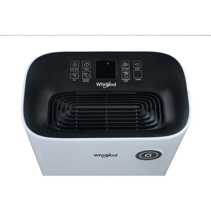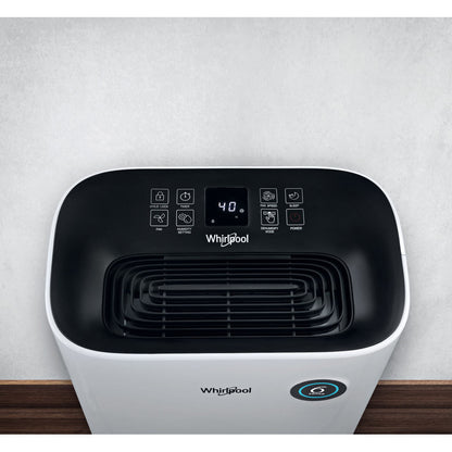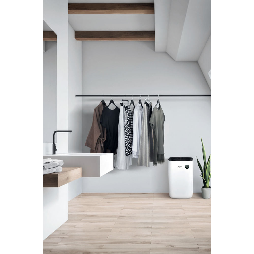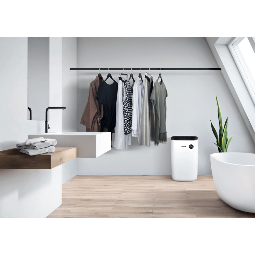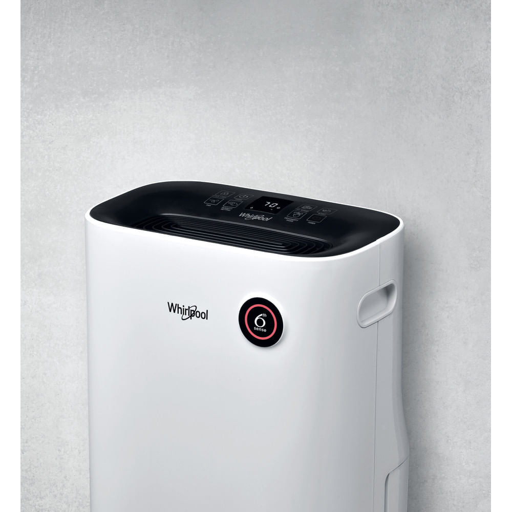 Desumidificador Whirlpool com capacidade de desumidificação de 20 L/dia e filtro de carvão ativo, ideal para áreas até 30 m².