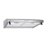 Exaustor standard de 60 cm com acabamento em inox e vidro, equipado com 3 velocidades e filtros de metal laváveis.