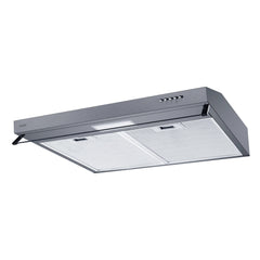 Exaustor standard de 60 cm com acabamento Silver+Vidro, equipado com 2 motores e 3 velocidades para extração eficiente.