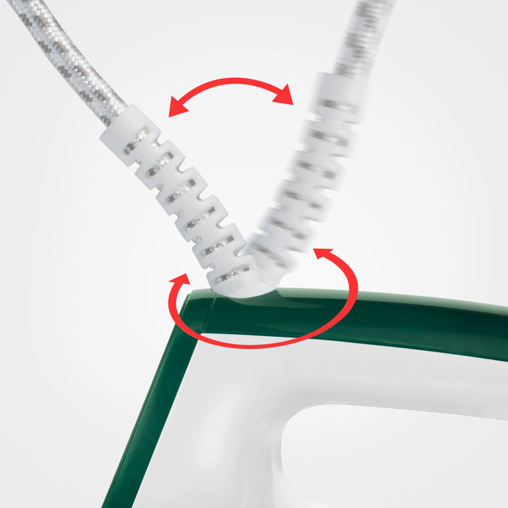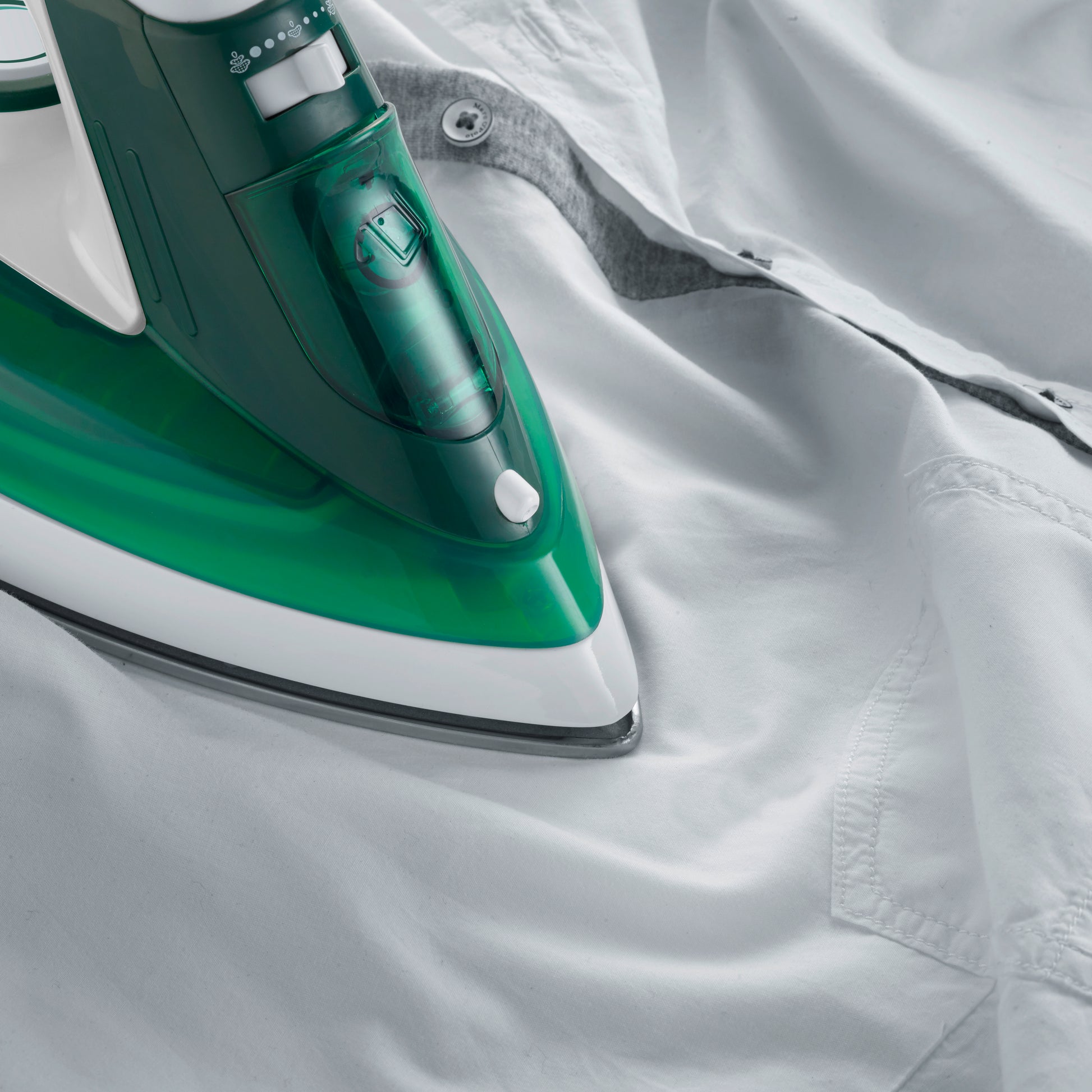 Ferro de engomar com potência de 2400 W e vapor variável até 30g/min, equipado com base em aço inoxidável para um deslizar eficiente.