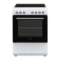 Fogão elétrico de 60 cm com forno ventilado de 65L e potência total de 6.000 W, ideal para cozinhar com eficiência e versatilidade.