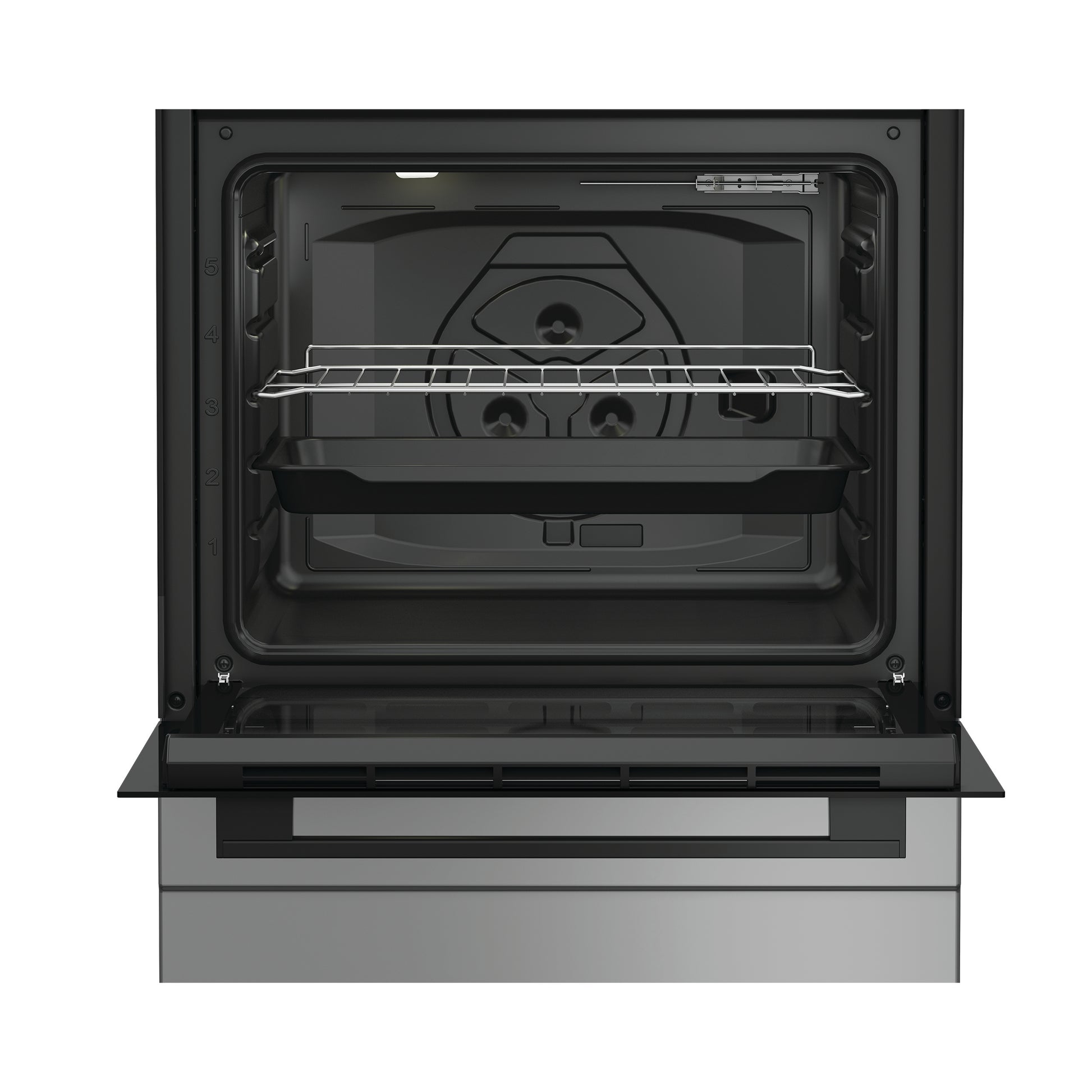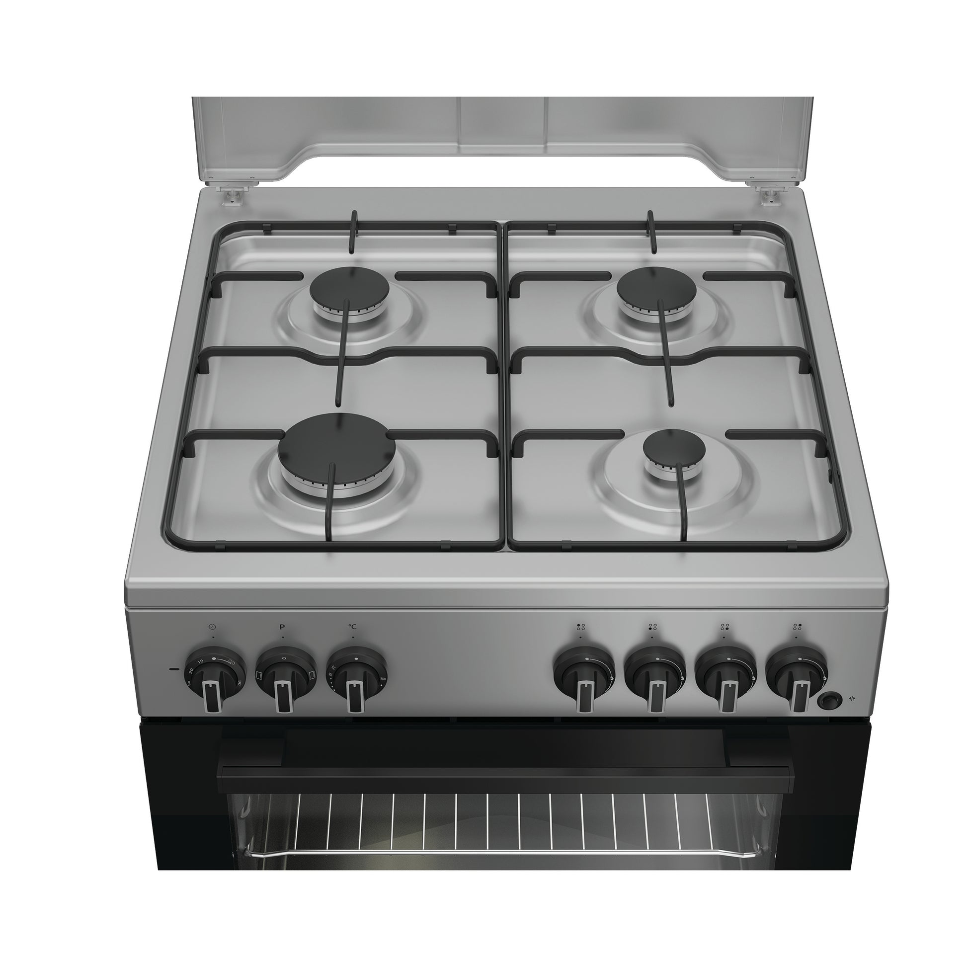 Fogão a gás natural com forno elétrico, capacidade do forno de 73 litros e 4 queimadores, equipado com grill elétrico e tampo metálico.