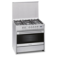 Fogão a gás independente de 90 cm com 5 queimadores de alta eficiência e forno ventilado de 126 litros, equipado com acendimento automático e classe energética A.