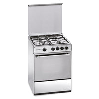 Fogão a gás de 60 cm com 4 queimadores de alta eficiência e forno a gás de 51 litros, equipado com termóstato para controlo preciso da temperatura.