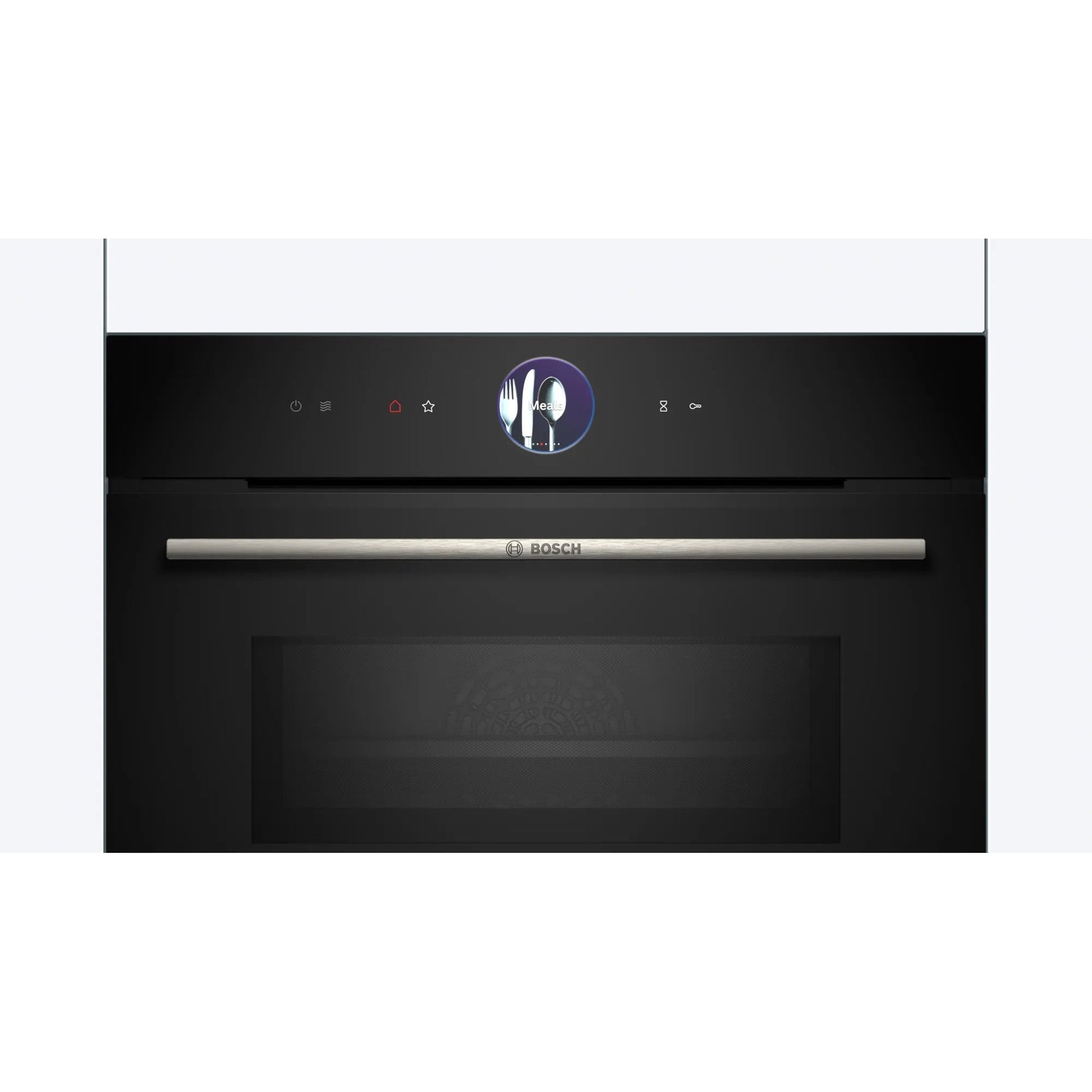 Forno compacto Bosch CMG7761B1 com capacidade de 47 litros, sistema de limpeza pirolítica e potência de 3600 W.