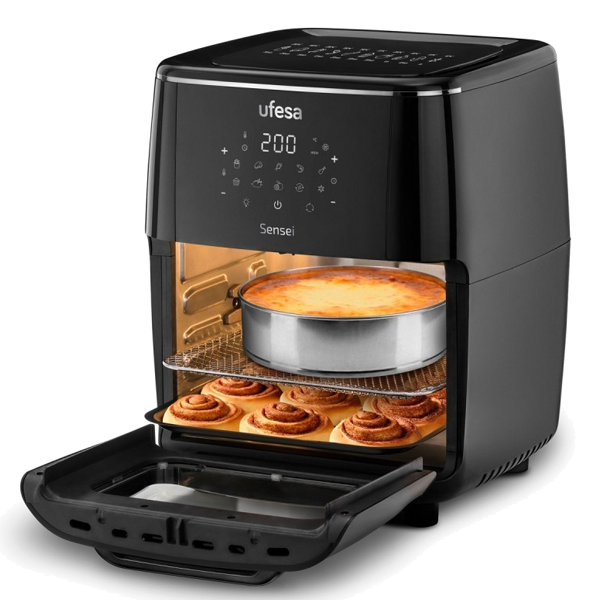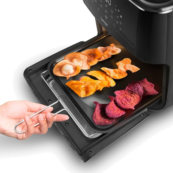 6 acessórios incluídos: 2 tabuleiros para assar, bandeja de recolha de óleo, pinças, cesto redondo giratório de 2.9lts e gancho para assador