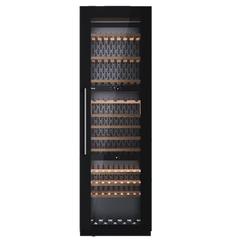 Garrafeira de integração com capacidade para 93 garrafas, três zonas de temperatura ajustáveis e display eletrónico com controlo de temperatura.