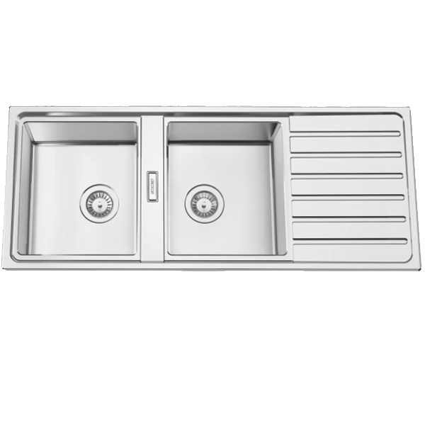 Lava Loiça Rodi Fusion 120 de encastrar em aço inox AISI 304 com medida externa de 1200x500mm e duas cubas de 340x400mm.