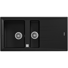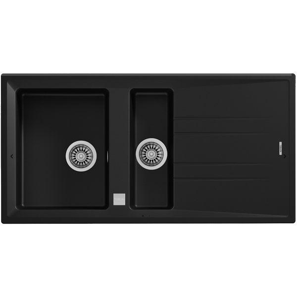 Lava-louças de encastre com duas bacias e escorredor, fabricado em Tegranito de alta resistência.