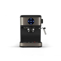 Máquina de café espresso com reservatório para café moído e espumador de leite integrado, capacidade de 1,5 L e pressão máxima de 20 bar.