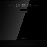Máquina de lavar louça Bosch SCX6ITB00ESER6 com capacidade para 8 talheres, painel frontal em vidro preto, classe energética E e consumo de 9 litros por ciclo.