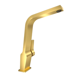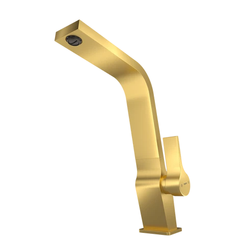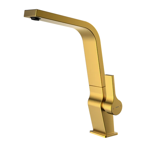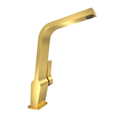 Misturadora monocomando de cozinha com bica alta giratória e acabamento em latão, equipada com tecnologia PVD para máxima durabilidade.