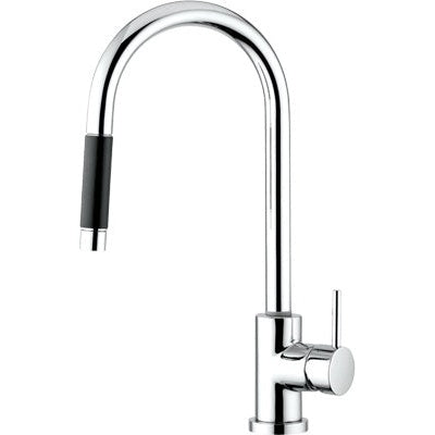 Misturadora monocomando com bica giratória, chuveiro extraível e acabamento cromado.