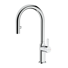 Torneira misturadora com cano alto giratório e flexível de 416 mm, equipada com chuveiro extraível de 2 saídas e filtro anticalcário.