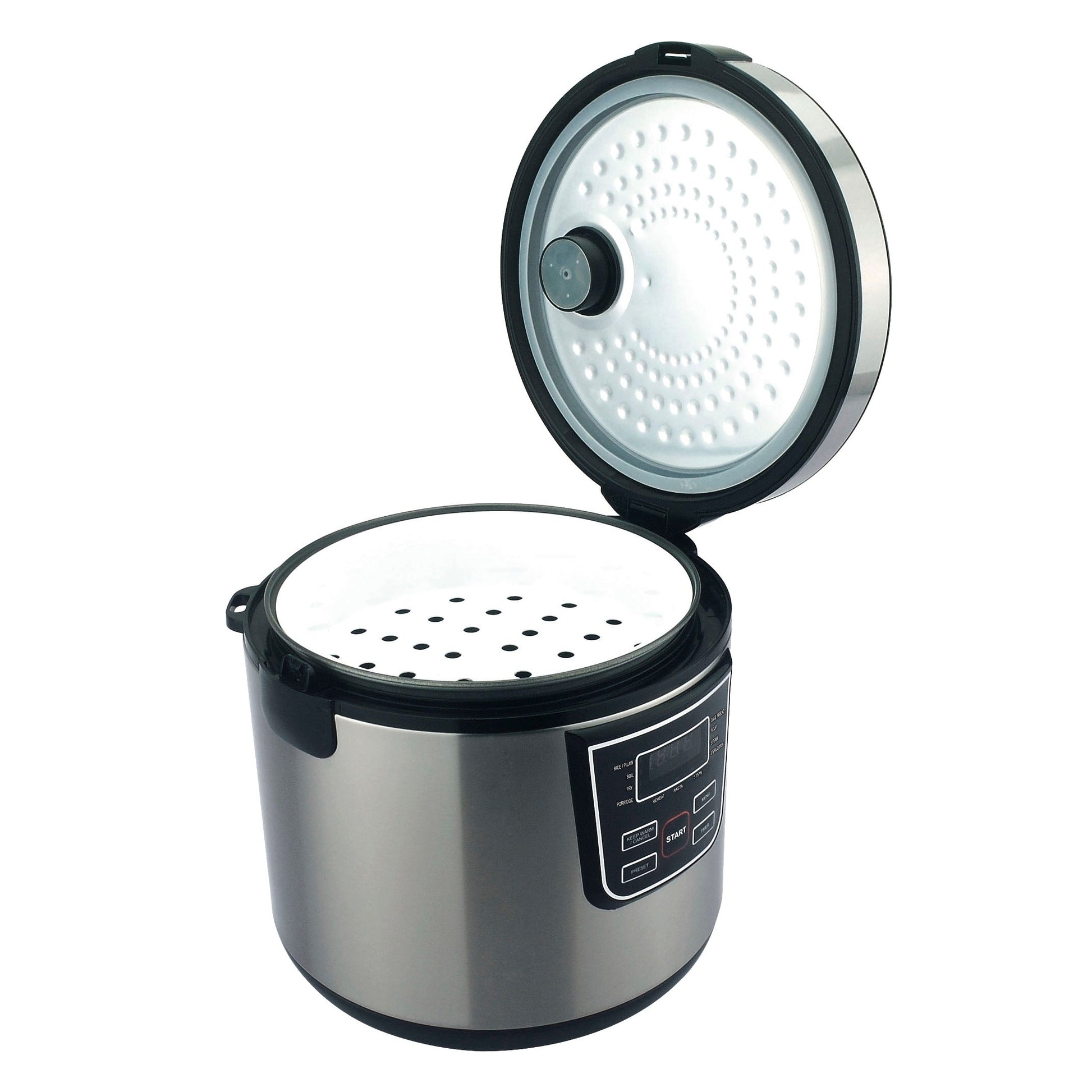 Panela multifunções de 5L com 11 programas automáticos e potência de 860W, equipada com display LCD e função de programação até 12 horas.