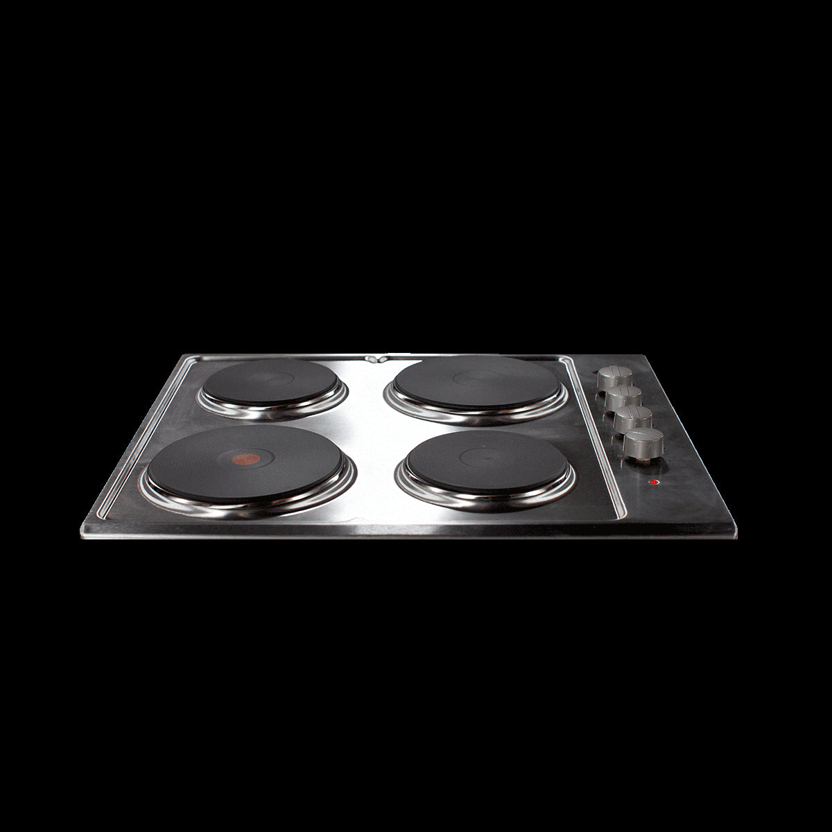 Placa elétrica de 4 zonas com potência máxima de 2000W e corpo em aço inoxidável, ideal para instalação em encastre.