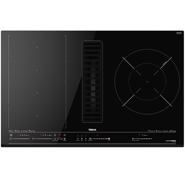 Placa de indução Teka com exaustor incorporado, 3 zonas, função Power, controlo multislider e motor EcoPower. Ideal para cozinhas modernas com extração eficiente e rápida.