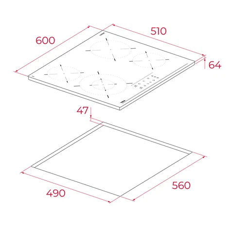 - Dimensões de encastre (A x L x P): 47 x 560 x 490 mm