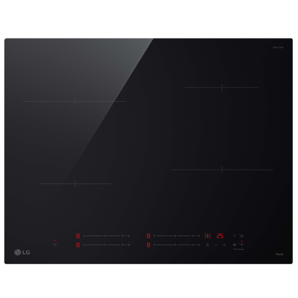 Placa de indução de 60 cm com 4 zonas de cozedura e potência total de 7.400 W, equipada com tecnologia LG ThinQ™ para controlo inteligente.