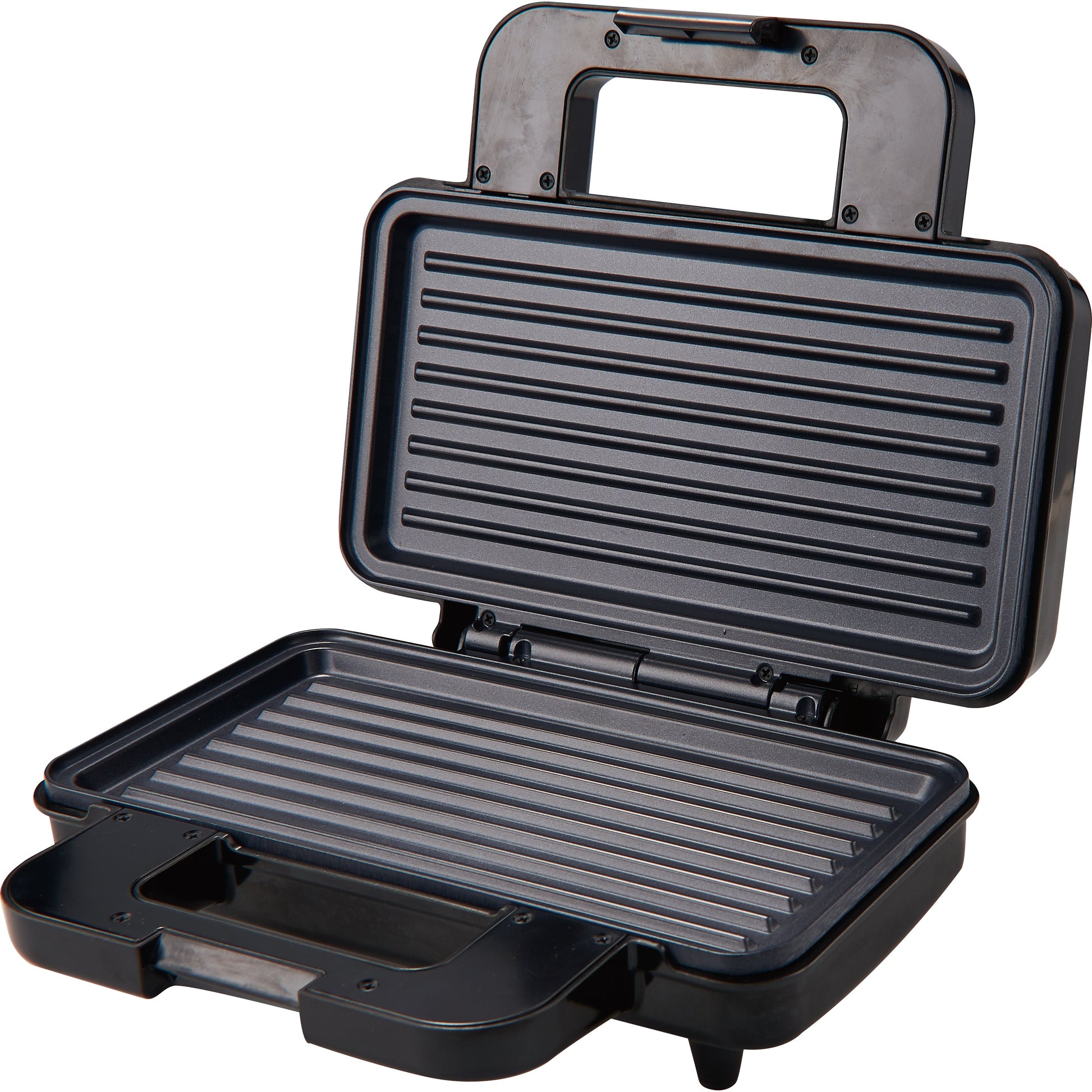 Sandwicheira com placas antiaderentes e capacidade para 2 sanduíches, com potência de 1000W e sistema de controlo por termostato.