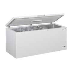 Arca congeladora horizontal com 600L de capacidade total, sistema de refrigeração estático e duas temperaturas de funcionamento. Inclui fechadura, alarme de temperatura e luz LED.