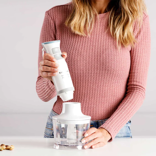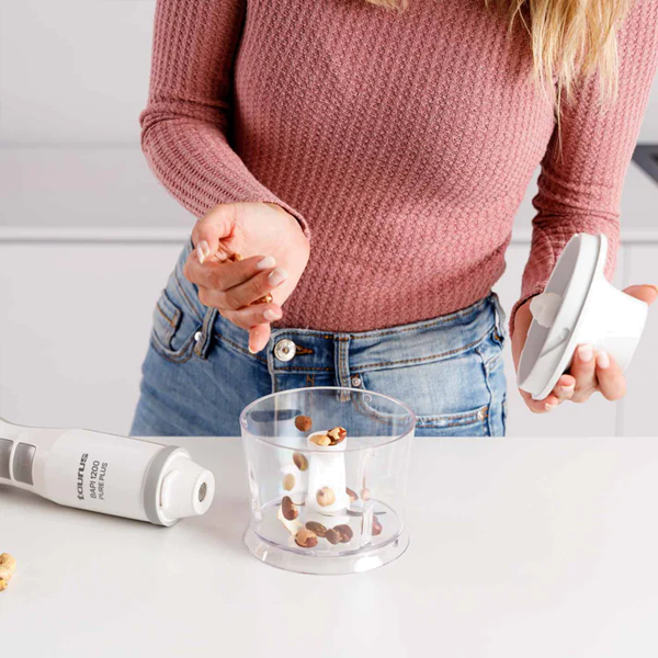 Varinha mágica de 1200W com sistema Turbo Rotation e regulador de 20 velocidades, inclui batedor, picador e copo medidor.