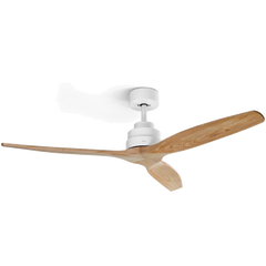 Ventoinha de teto com motor DC de 40W ultra-silencioso, 3 lâminas de madeira natural e diâmetro de 132 cm, ideal para climatização eficiente e silenciosa.