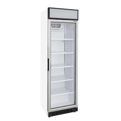 Vitrine vertical com porta de vidro e iluminação LED, com capacidade bruta de 373L.