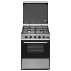 Fogão a gás com 4 queimadores e forno a gás de 54L. Este fogão a gás butano apresenta uma mesa de trabalho em inox e pés reguláveis.